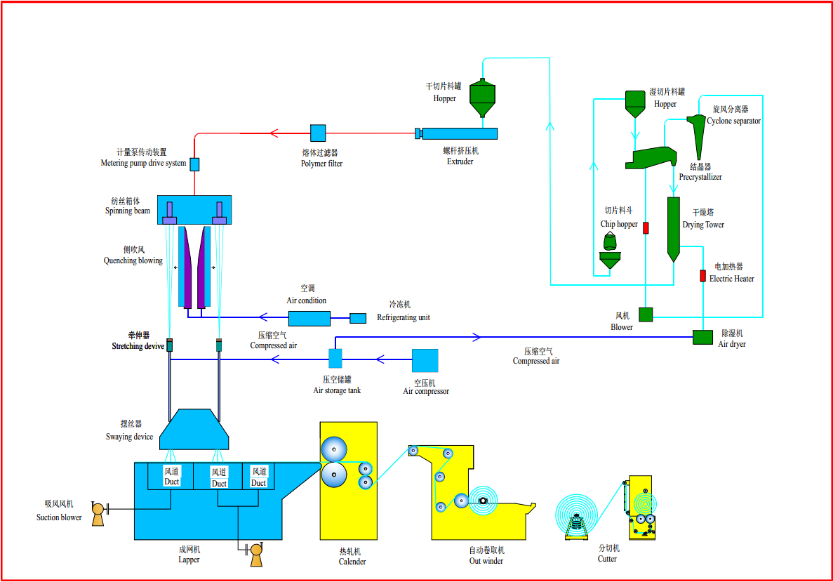 管式牵伸聚酯纺粘热轧非织造布具有抗拉强力高、纵横向强力比小、尺寸稳定性好、耐老化、抗腐蚀等特性。