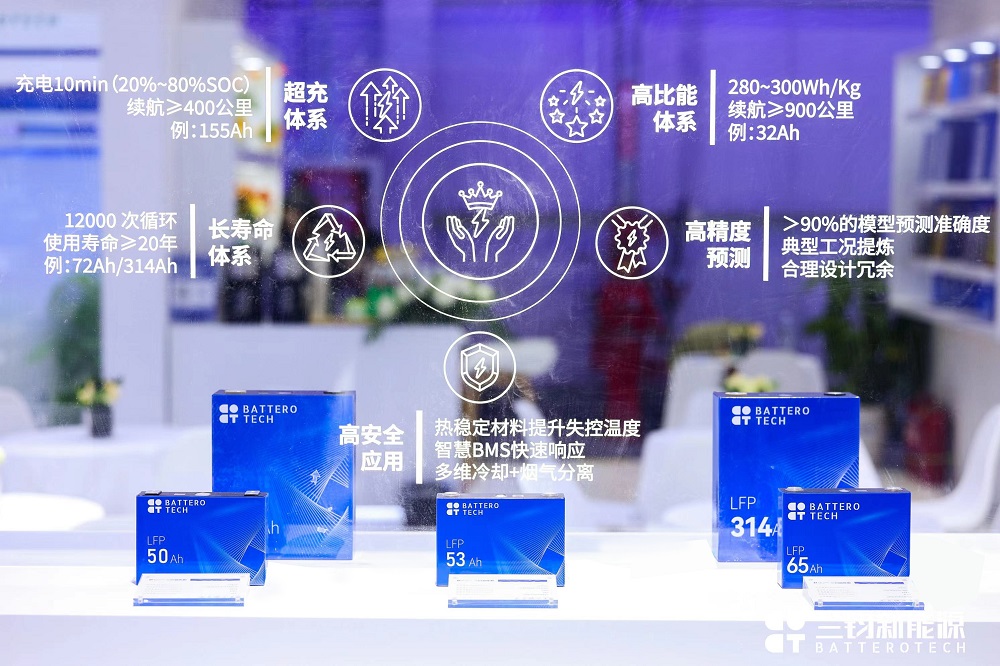 除大容量电芯外,兰钧新能源还带来了50Ah、53Ah、65Ah、72Ah、115Ah、280Ah等电芯产品,以及1P16S风冷插箱、1P52S液冷标准箱、1P416S博力酷储能柜等储能系统产品。