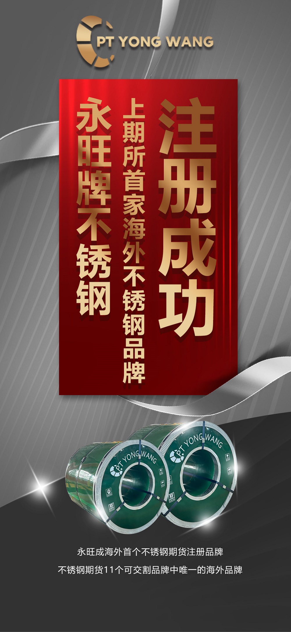“YONG WANG”牌不锈钢是上期所首家海外冷轧交割品牌,此次注册成功是对印尼永旺不断优化内部质量管理体系、全面提升产品质量的充分肯定,将进一步提升“YONG WANG”牌不锈钢的市场流通性、品牌价值及品牌知名度。